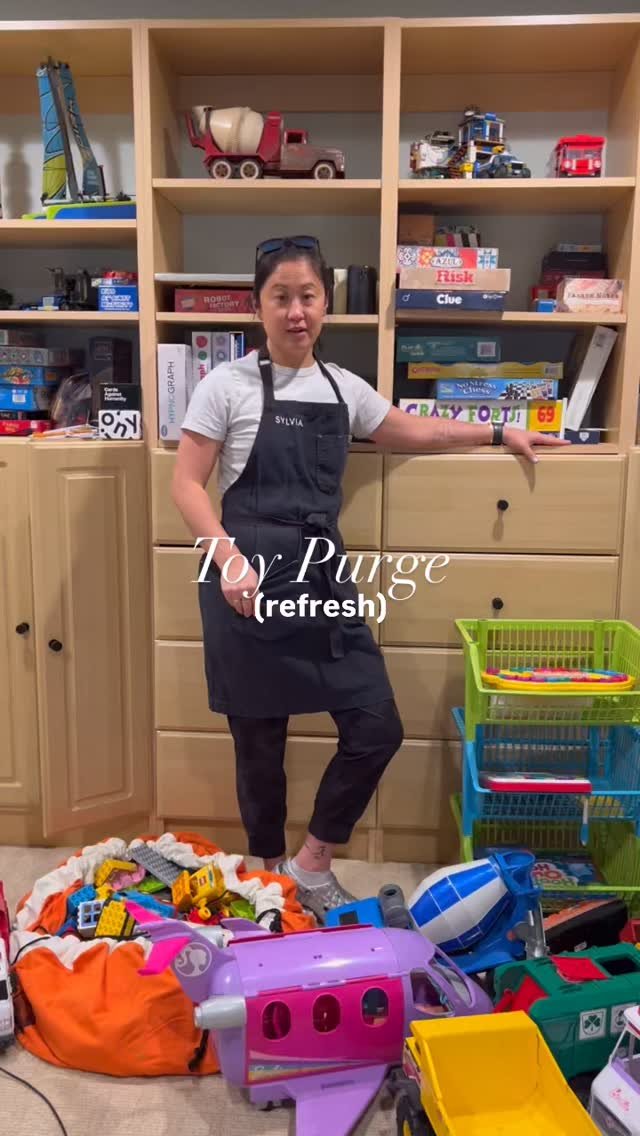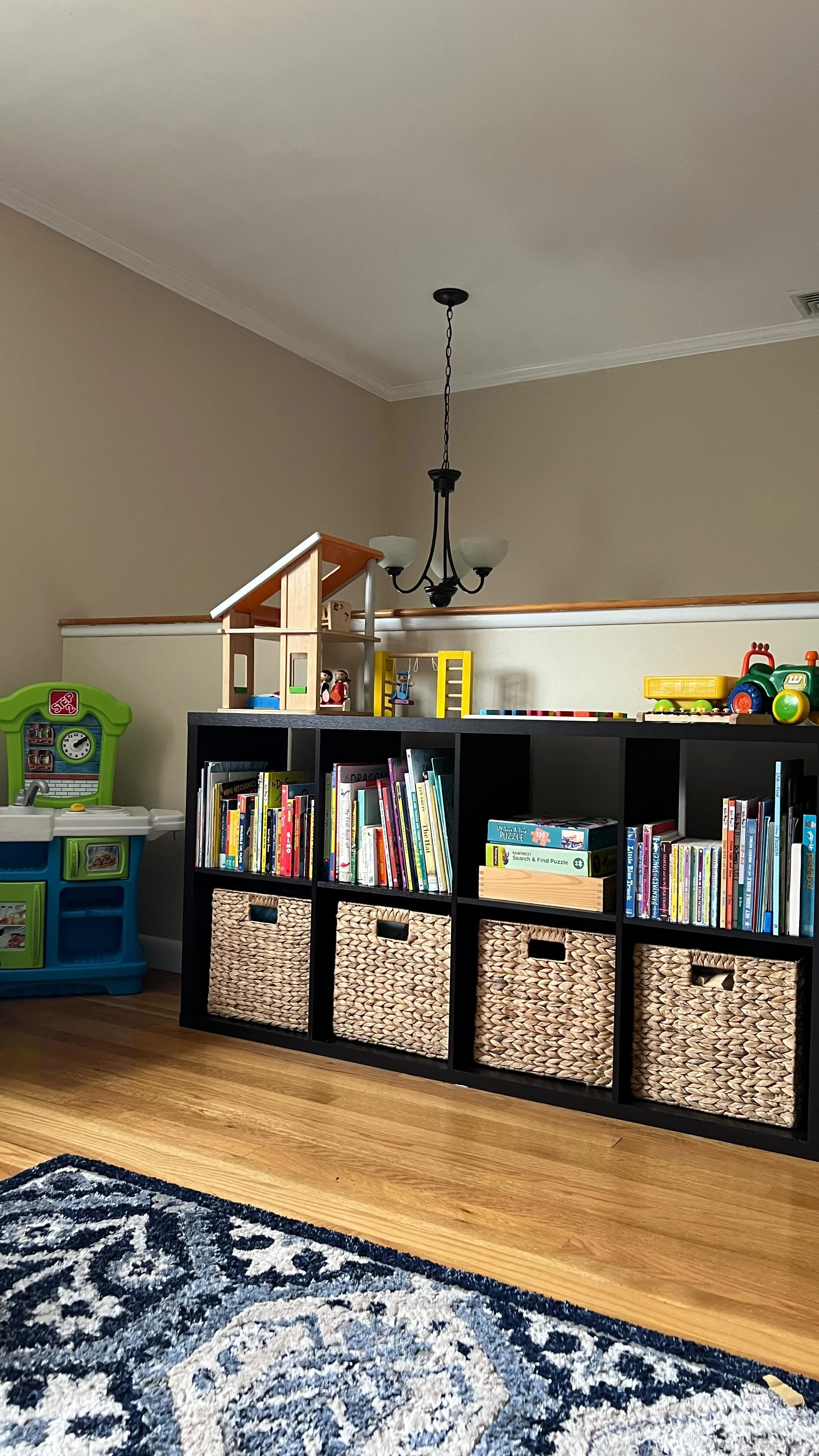 You don’t need to buy new storage containers or furniture to refresh a space! My client had a great family room and play space in her basement but it was always left in disarray with her kids’ stuff and toys scattered all over. I helped her think through how to better define what happened where and then I rearranged her existing furniture and storage to support those activities and clean up afterwards.